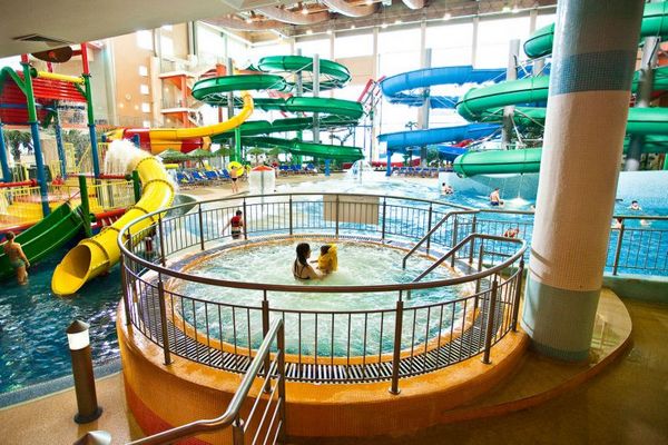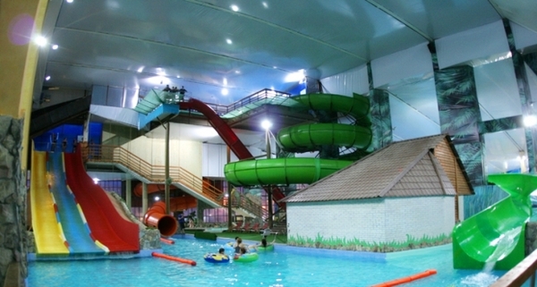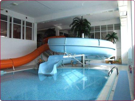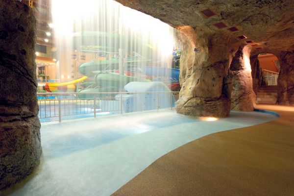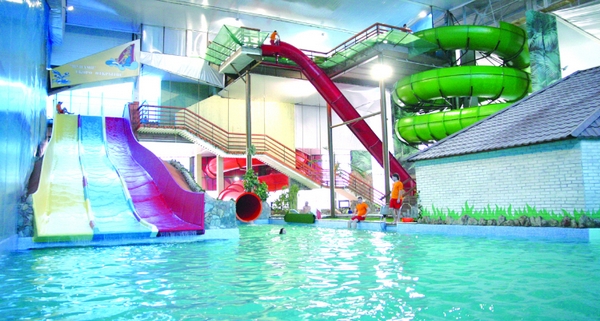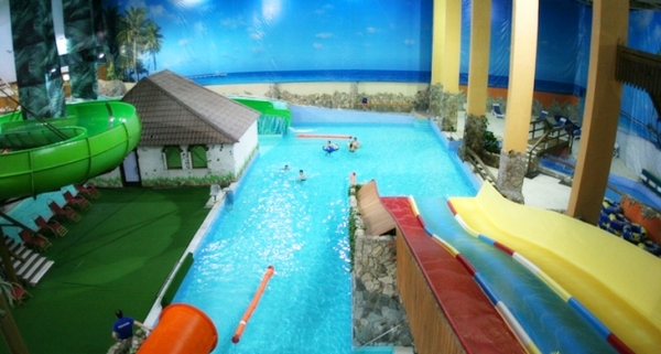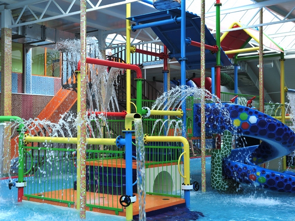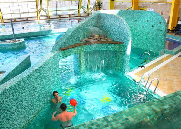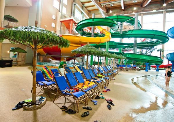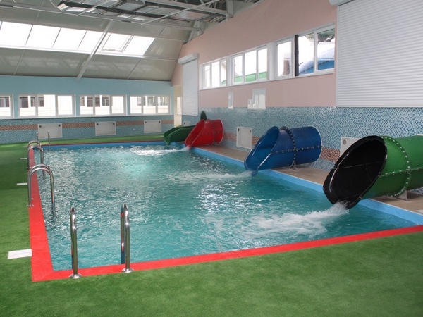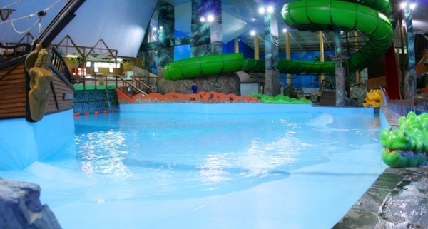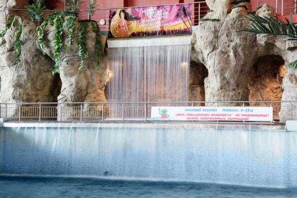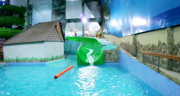 В аквапарке большая горка для взрослых и две маленьких для детей, система водопадов, гидромассажные ванны, имитация морской волны, джакузи, бассейн для грудничков.