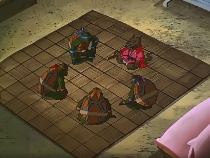 Чтобы победить его, Черепашкам приходится отправиться в Измерение Икс и забрать старый корпус андроида Крэнга (да-да, то самый, в животе которого сидел этот розовый мозг). Донателло и Микеланджело проникают на разрушенный Технодром, где мельком показывают унылых Шреддера и Крэнга, которые окончательно проиграли и уже ни на что не влияют. Это даже немного грустно - видеть «легенд» злодейства в таком жалком состоянии.