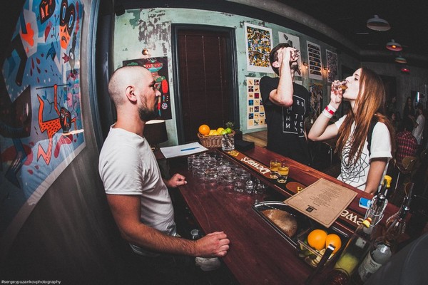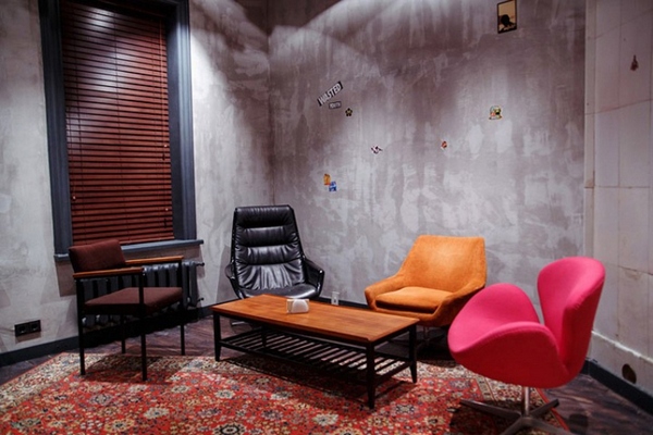 Уютный интерьер студии контрастирует с интерьером бара, стены которого неровно выкрашены в серый цвет, а полы небрежно покрыты коврами. Впрочем, эта небрежность создает свою особую атмосферу, притягивающую посетителей.