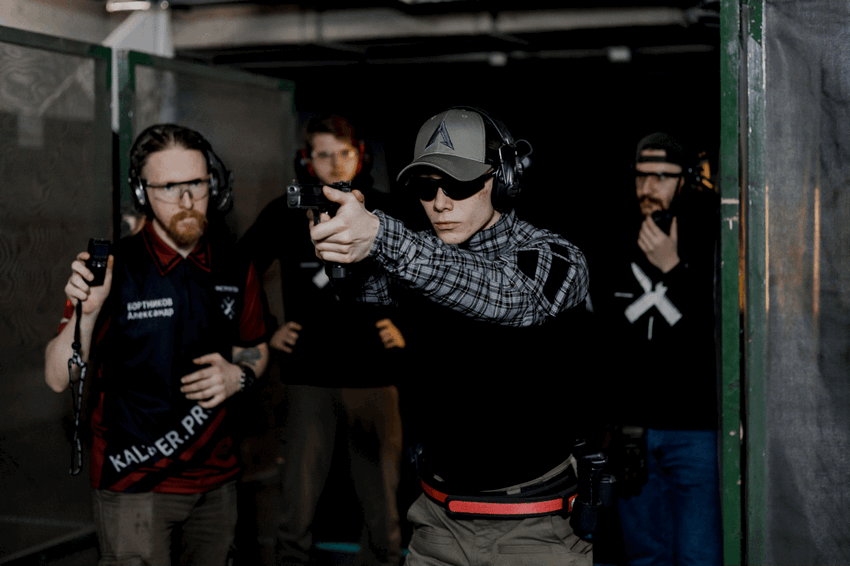 Все необходимое снаряжение вам выдадут в клубе. На первом занятии обычно дают только наушники и очки. На последующих – уже дополнительно ремень с подсумками и с кобурой.