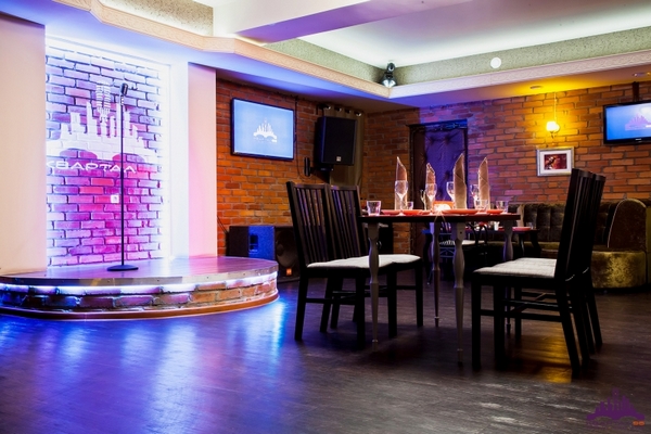 Клуб очень стильный, уютный. Гости располагаются в центре большого зала на удобных диванах, сводчатый кирпичный потолок придает интерьеру брутальности и улучшает акустику помещения. Для частных караоке-вечеринок и банкетов используется изолированный зал на 30 человек.