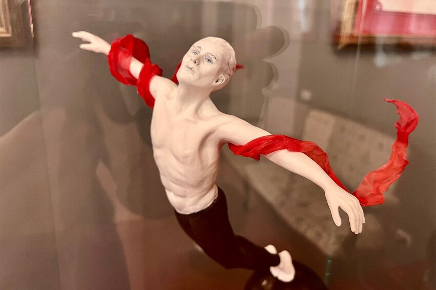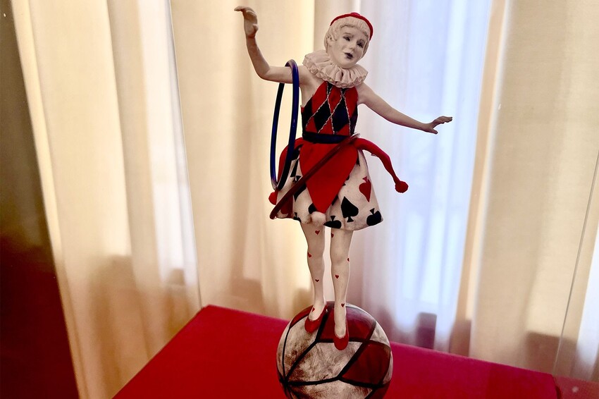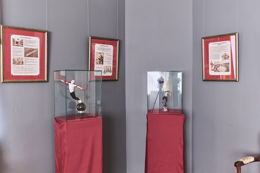 Пространство экспозиции разделено на несколько зон: репродукции на стенах, витрины с экспонатами, информационные плакаты. Особенно впечатляют работы Надежды Золотухиной: куклы-акробаты и клоуны замерли в сложных, будто невесомых позах. Материал – полимерная глина, податливая и капризная. Но результат – кажется, фигуры парят в воздухе.