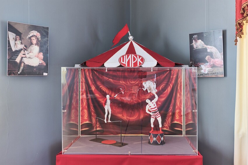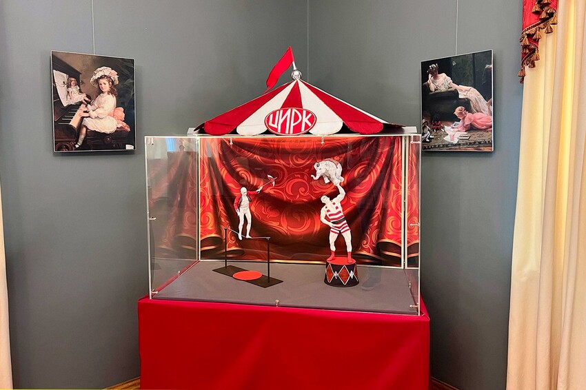 Экспозиция не ограничивается демонстрацией красивых фигур. Здесь есть внутренняя логика, связывающая игру, детство и магию цирка. Как объясняет куратор, цирк часто ассоциируется именно с детством – миром фантазии и открытий. В этой цепочке у куклы особая роль: она становится медиатором между детской игрой и миром профессионального искусства. Репродукции старинных картин, на которых изображены дети с куклами, соседствуют с цирковыми персонажами, так рождается целая история.
