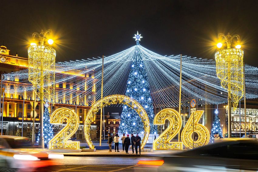 Где делать фото: у елки под куполом из гирлянд, рядом сияющие деревья и огромные атмосферные цифры 2026.