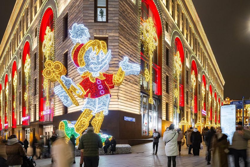 От Лубянки направляйтесь на Никольскую - одну из самых фотогеничных улиц Москвы. Знаменитое «звездное небо» над головой по-прежнему на месте. Это классика новогодней Москвы: миллионы огоньков ведут вас прямо к Красной площади