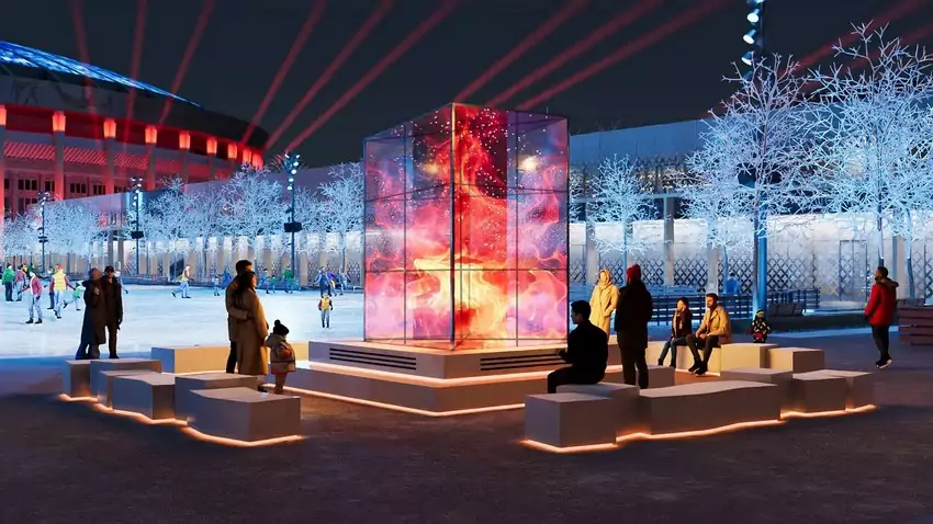 Куб Энергии расположен со стороны набережной и представляет собой настоящее сердце катка. Потоки тёплой энергии бегут по граням этого объекта, переливаясь от насыщенного фиолетового до яркого жёлтого цвета. Свет отражается на льду под ногами, создавая эффект движения даже когда вы стоите на месте. Подойдите ближе - внутри инсталляции горит настоящий костёр, у которого можно согреться после катания.