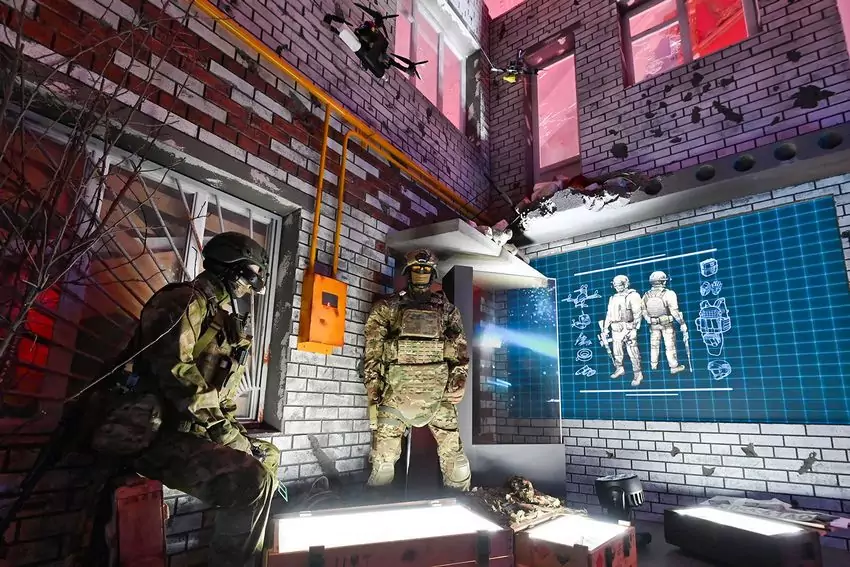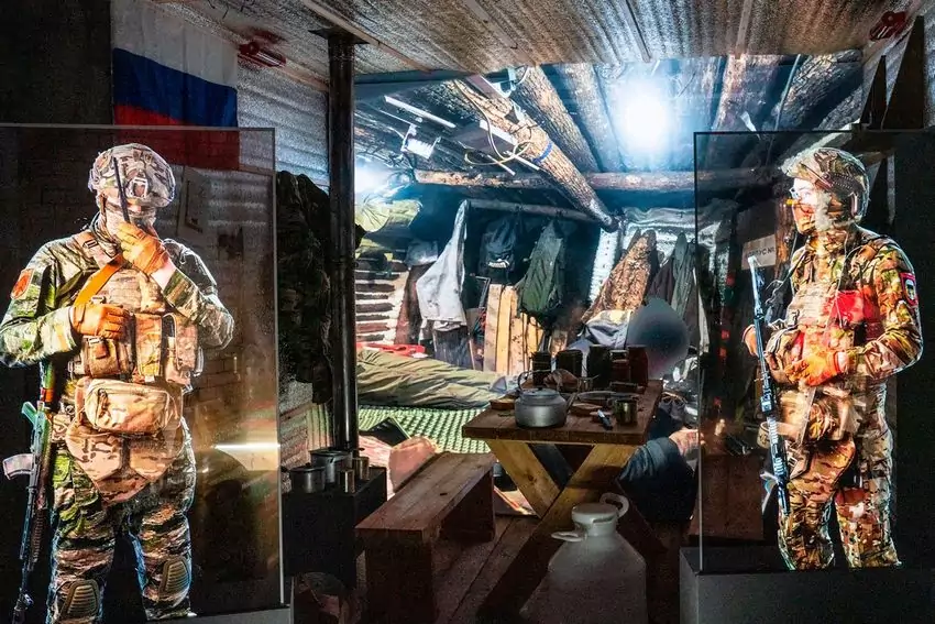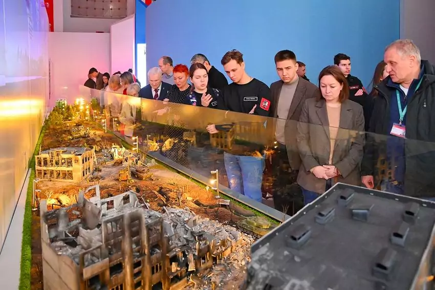 - Макет зоны боевых действий в масштабе 1:35 воссоздаёт один из эпизодов битвы за Артемовск (Бахмут). Техника, здания и рельеф — всё отображено с высокой точностью. Над макетом — интерактивный экран с информацией о вооружении и технологиях.