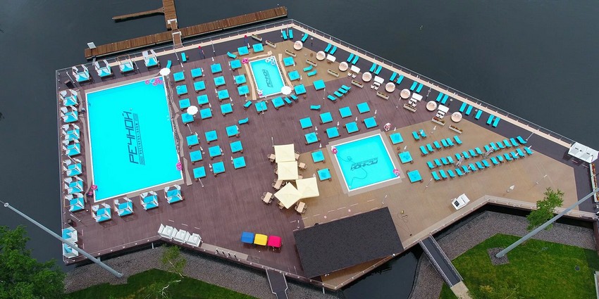 Изюминкой комплекса являются понтонные бассейны, наполненные очищенной речной водой. Два просторных бассейна размером 5 на 15 метров и глубиной 1,5 метра ждут взрослых посетителей, а для юных купальщиков предусмотрен отдельный водоем поменьше - 3 на 5 метров с глубиной всего 60 см.