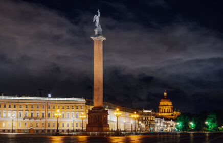 Посреди Дворцовой площади расположена Александровская колонна – монумент высотой в 47,5 метров, выполненный из гранитного монолита. Автор памятника – архитектор Огюст Монферран. Установка колонны состоялась в 1832 году и была приурочена к годовщине победы в Отечественной войне. Венчает колонну 4-метровая статуя ангела, держащего в руке 6-метровый крест.