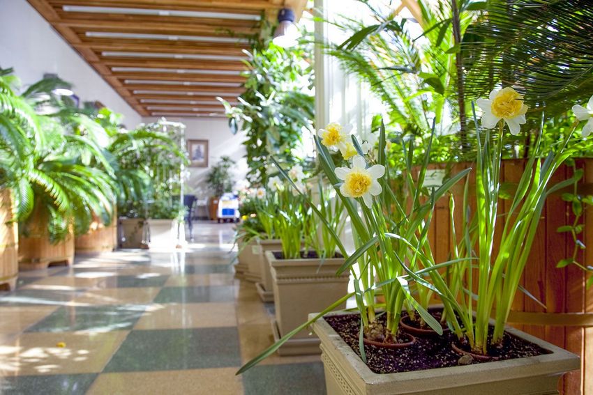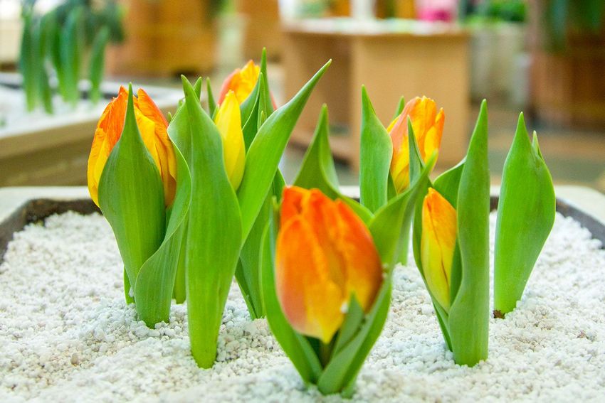 За три недели до предполагаемого цветения луковицы перемещают в отдельное помещение, где поддерживается всё тот же «зимний» режим. И только когда первые ростки дают о себе знать, растения переносят на свет, постепенно повышая температуру до плюс 18 градусов. Такой подход позволяет добиться одновременного, дружного цветения самых разных видов – именно поэтому посетители могут видеть такое буйство красок.