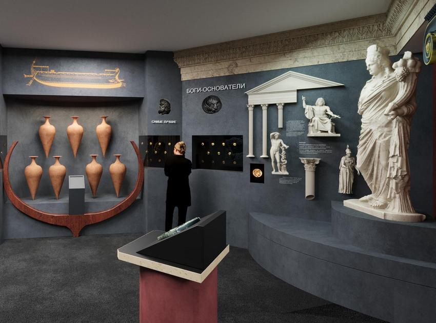 Оформление выставки - отдельное произведение искусства. Художник проекта Пётр Бирюков воссоздал атмосферу древнегреческой архитектуры. Центральный элемент экспозиции - реконструкция храма. Но не того белого, стерильного храма, каким мы привыкли видеть античность в учебниках истории. Нет!
