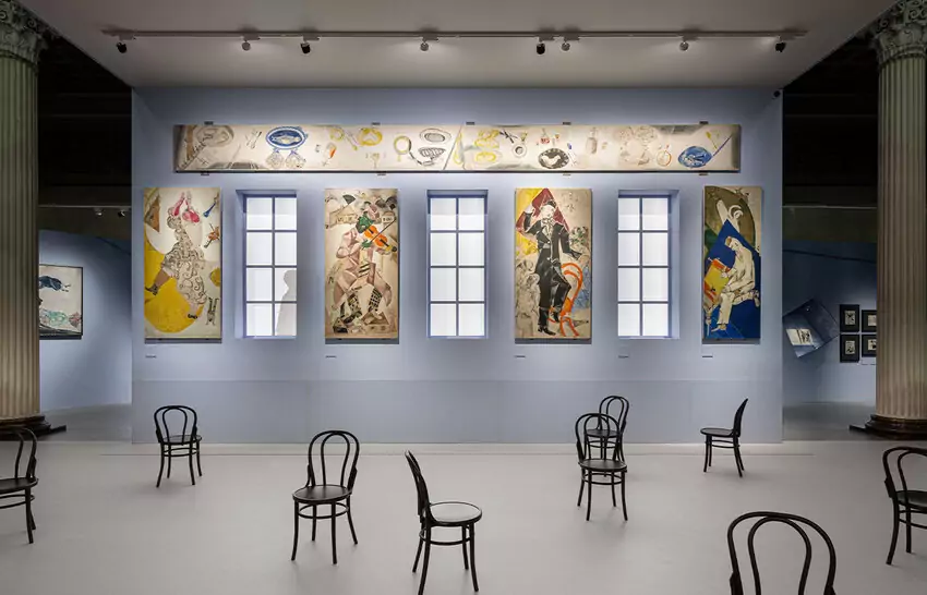 В Белом зале музея воссоздан интерьер зрительного зала Еврейского камерного театра, для которого Шагал создал серию панно в 1920 году. Из девяти работ сохранилось семь, и они станут важной частью экспозиции. Там же можно будет прочитать письмо художника в дирекцию театра, где он просит разрешения показывать свои росписи не только зрителям спектаклей, но и широкой публике.