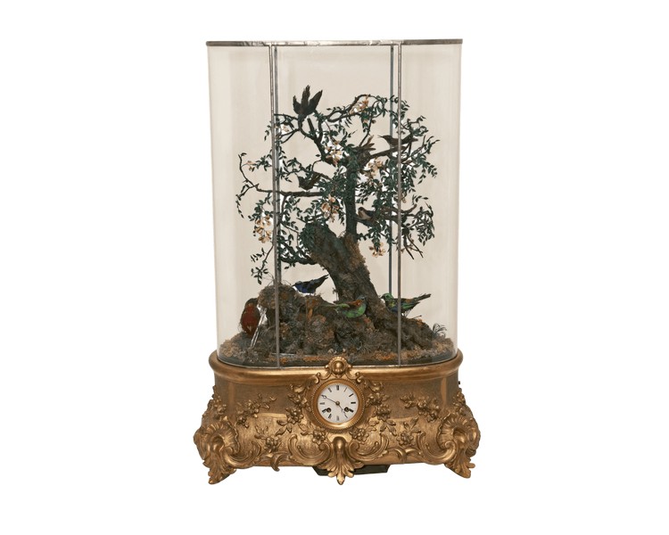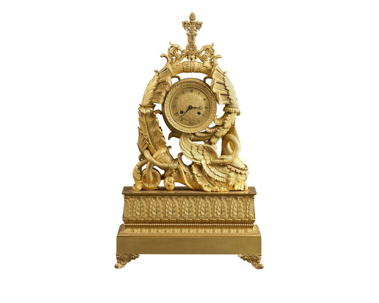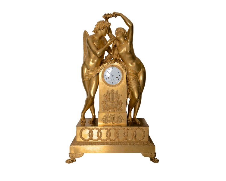 Не остались без внимания и работы французских мастеров. Каминные часы «Амур и Психея», созданные в 1820 году, поражают утонченностью композиции: нежное прикосновение героев, мифологический сюжет, а ножки-подставки в виде крылатых львиных лап выглядят как миниатюрные скульптуры.