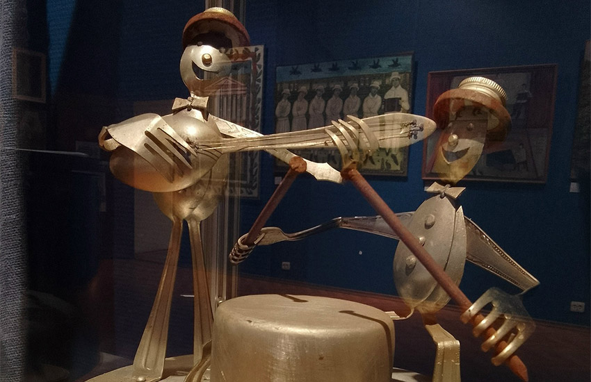 Особое место в пространстве выставки занимает серия деревянно-металлической скульптуры художника Владимира Ивановича Агапова. Эти работы поступили в Музей русского лубка и наивного искусства в конце 2025 года и стали настоящим открытием как для сотрудников музея, так и для первых посетителей. Скульптуры Агапова отличаются оригинальным сочетанием материалов и выразительной пластикой, они словно оживают в пространстве экспозиции, добавляя ей объем и новое измерение.